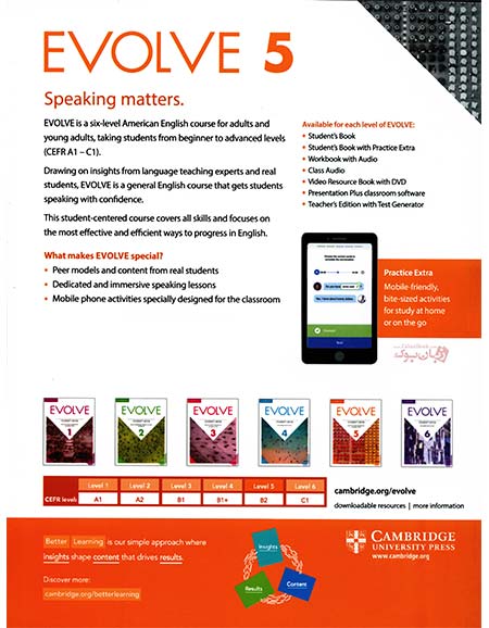 کتابهای Evolve یک مجموعه آموزش زبان انگلیسی هستند که توسط انتشارات Cambridge University Press منتشر شدهاند. این مجموعه بیشتر برای بزرگسالان و نوجوانان سطح متوسط طراحی شده و روی ارتباط واقعی در زندگی روزمره تمرکز دارد.به طور کلی، این مجموعه برای کسانی که میخواهند زبان انگلیسی را به شکل مکالمهمحور یاد بگیرند، خیلی مفید است.