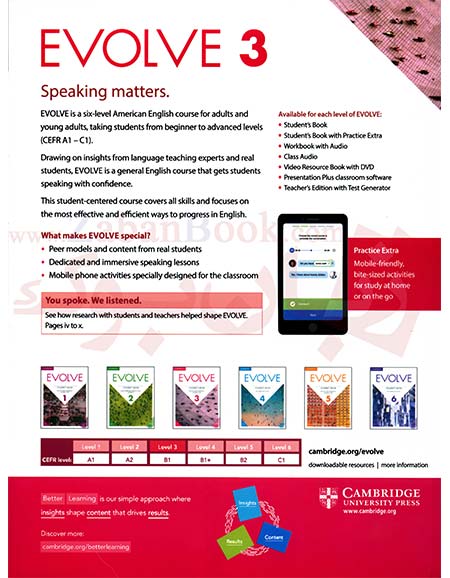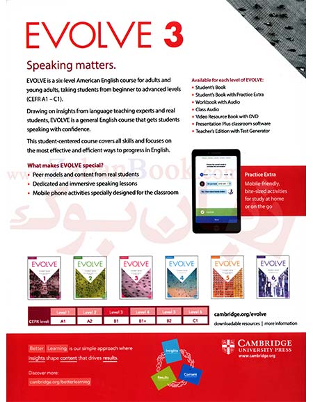 کتابهای Evolve یک مجموعه آموزش زبان انگلیسی هستند که توسط انتشارات Cambridge University Press منتشر شدهاند. این مجموعه بیشتر برای بزرگسالان و نوجوانان سطح متوسط طراحی شده و روی ارتباط واقعی در زندگی روزمره تمرکز دارد.به طور کلی، این مجموعه برای کسانی که میخواهند زبان انگلیسی را به شکل مکالمهمحور یاد بگیرند، خیلی مفید است.
